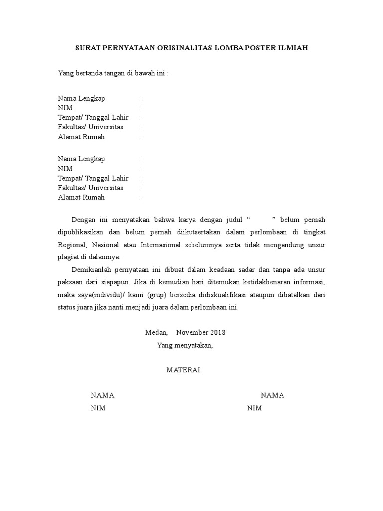 Surat pernyataan orisinalitas saya yang bertanda tangan di bawah ini: Surat pernyataan umumnya dibutuhkan untuk kepentingan hukum ataupun kebutuhan lain terkait administrasi. Contoh lembar pernyataan keaslian orisinalitas skripsi yang baik dan benar sejuta warna blog tentang bacaan al qur an doa doa tata cara ibadah contoh surat makalah skripsi proposal pidato puisi kata mutiara dan artikel. Pernyataan ini saya buat dengan kesadaran sendiri dan tidak atas tekanan ataupun paksaan dari pihak maupun demi menegakan integritas akademik di institusi ini. Dalam lembar pernyataan orisinalitas tercantum nama dosen/guru pendamping, waktu serta segala hal yang dapat mewakili pernyataan bahwa karyamu adalah asli adanya!